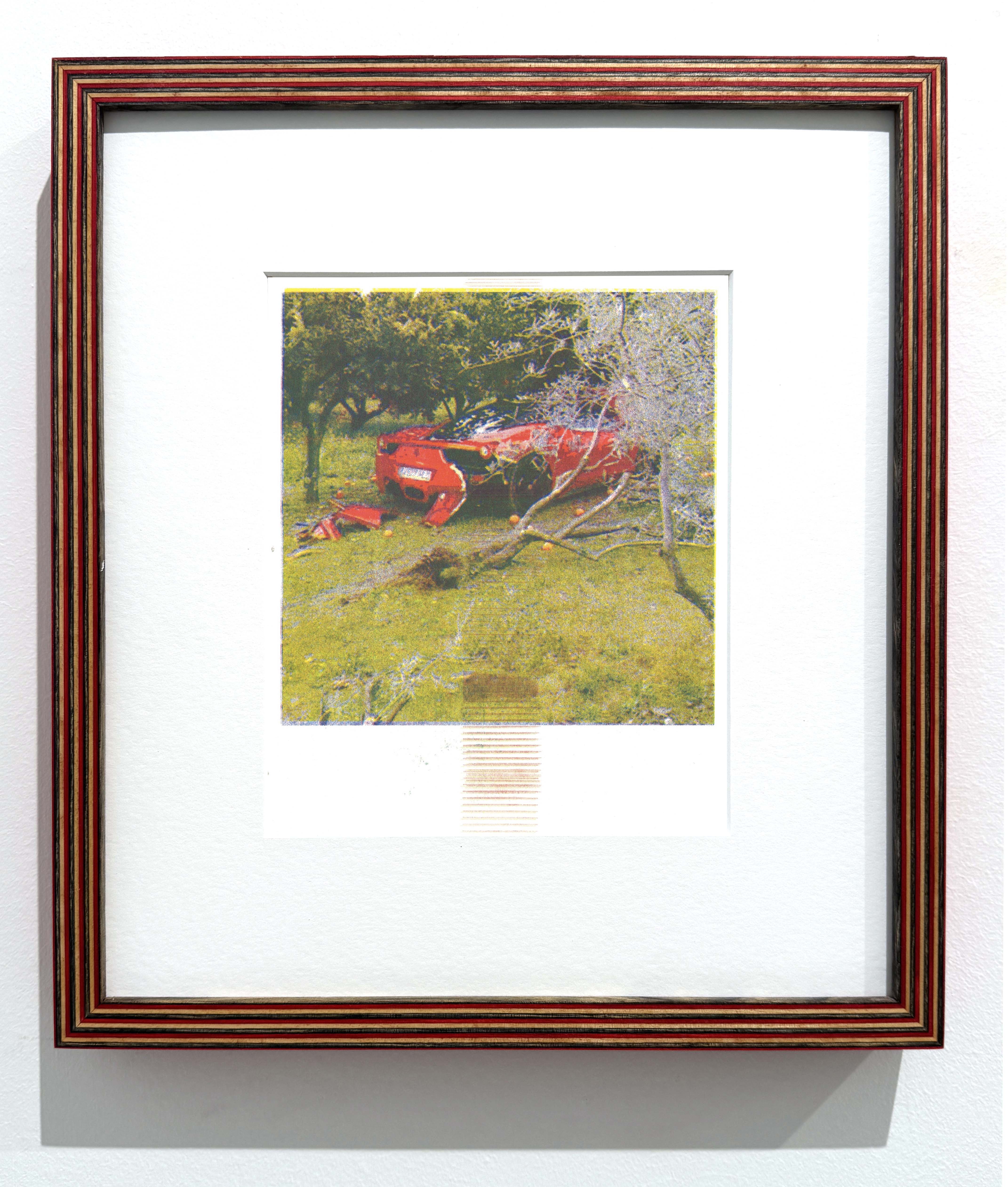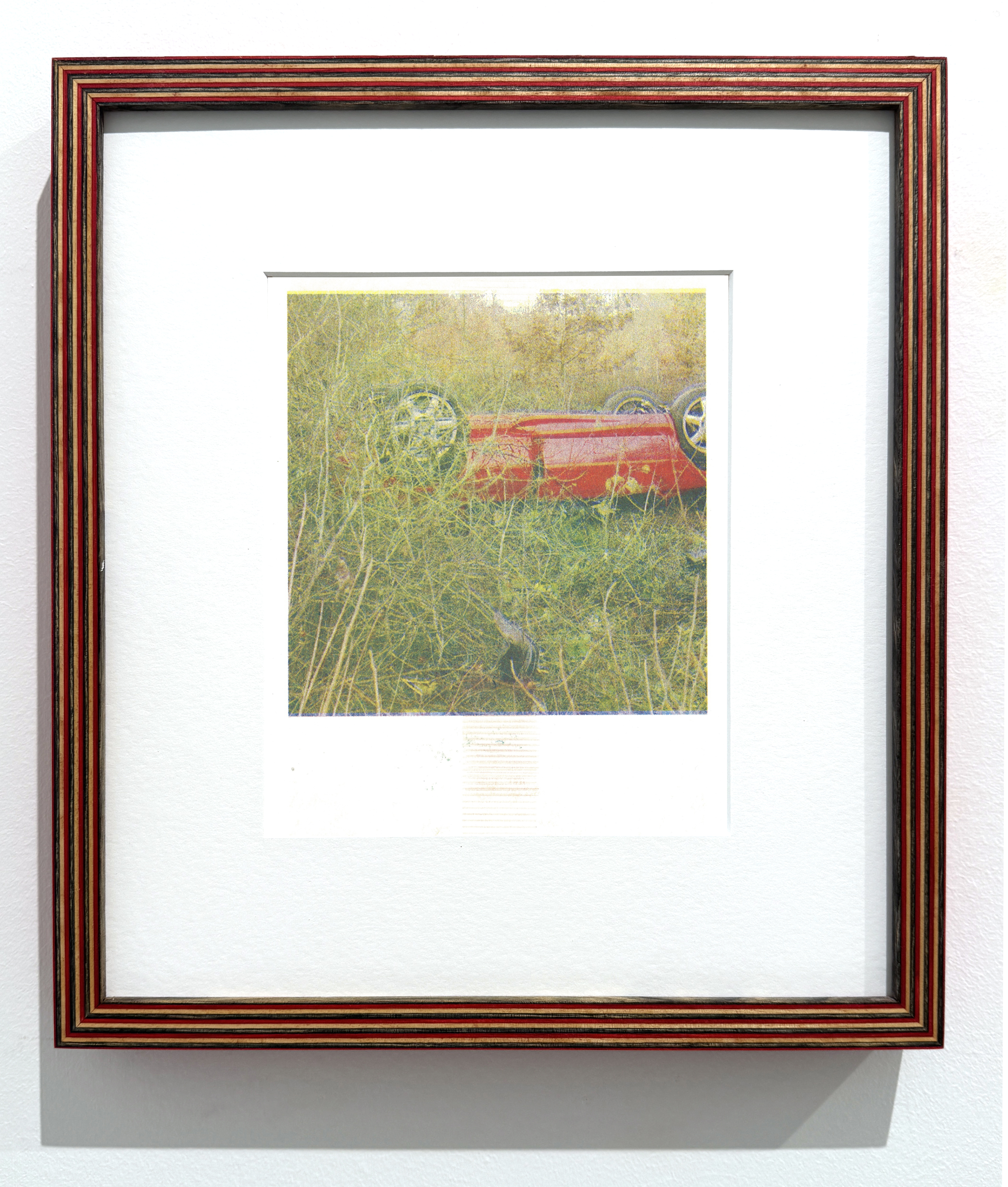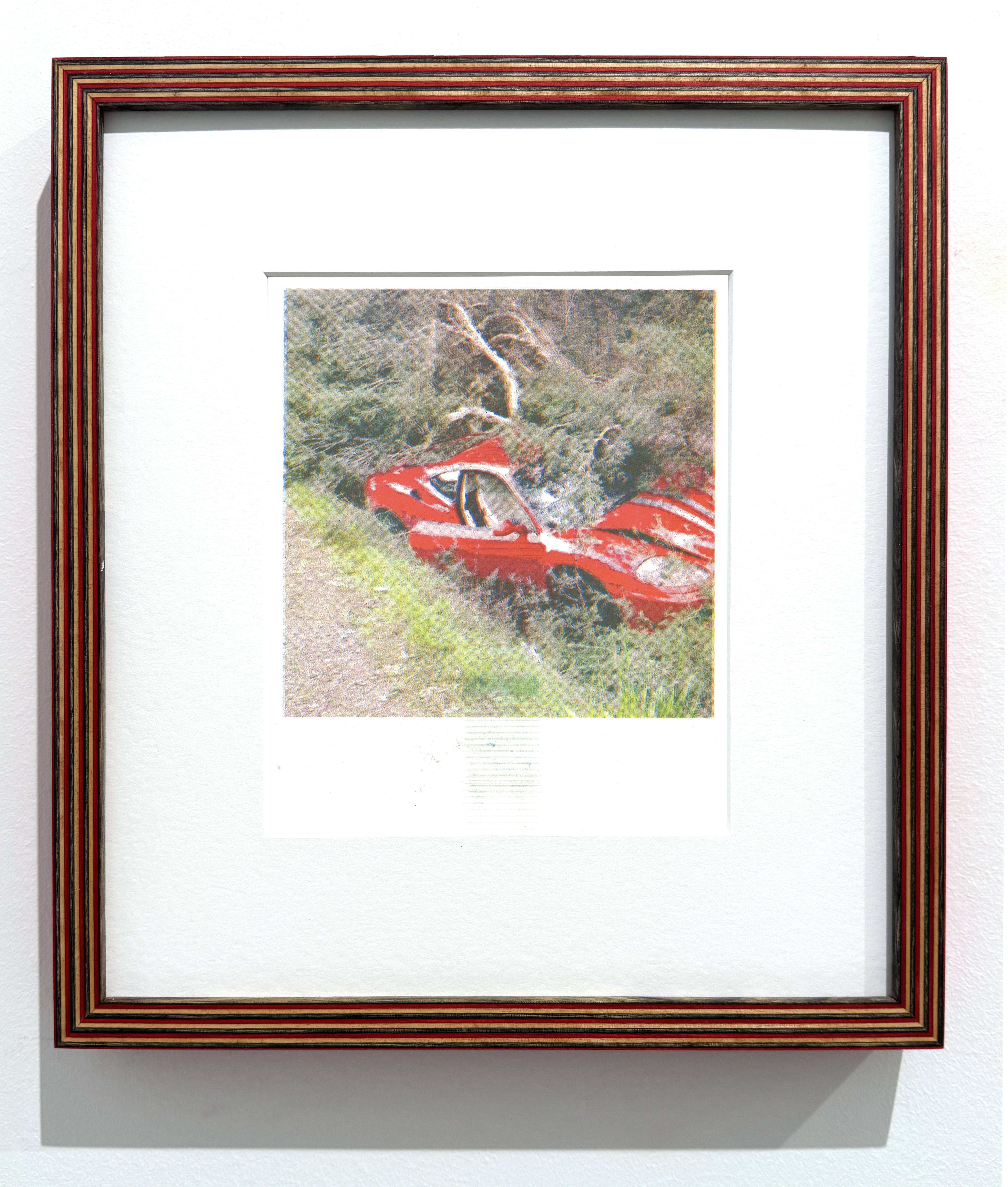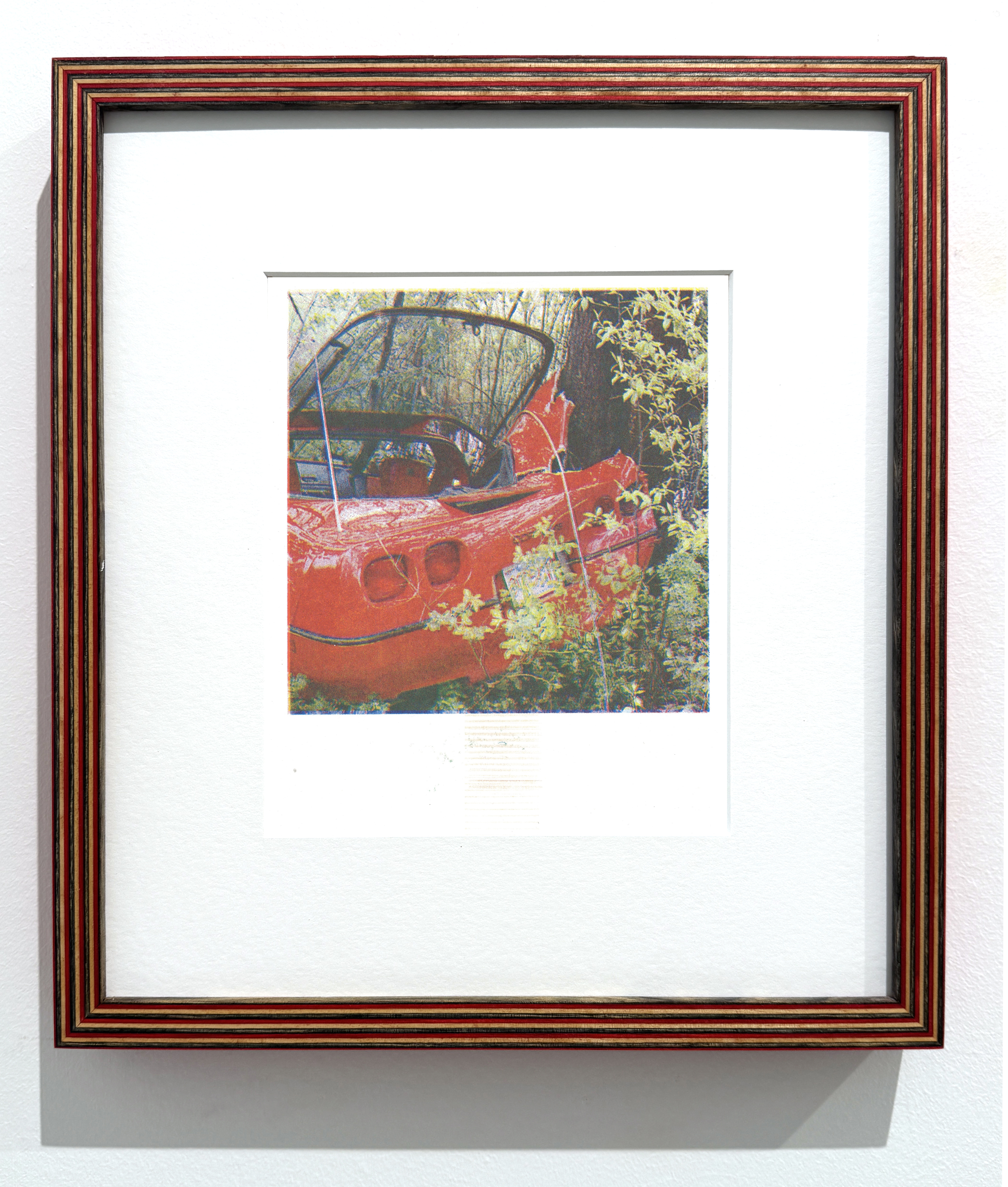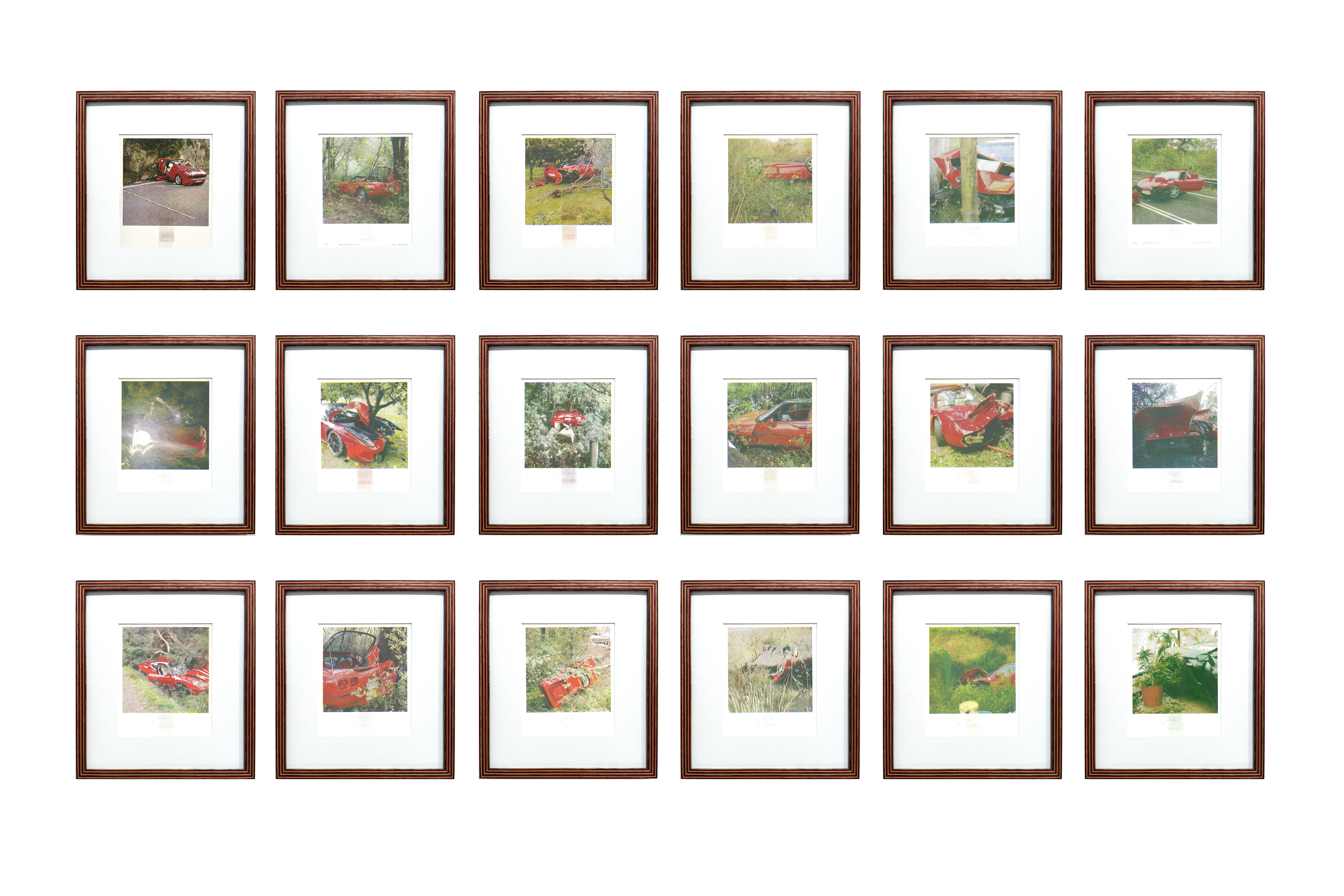 Glen Baldridge’s Exotics are mementos to a chosen set of wasted classics: a Ferrari Testarossa, a Corvette... The scale is small: glimpsed moments, an intimate pocket size for a coveting voyeur. I am reminded of Carlo Mollino’s Polaroids, in nod to a link between the provocative stagings of lovers in moody constructed dollhouses, smudging objectification, and Mollino’s deep love for Bisiluro Damolnar, the red Le Mans car that he designed and built in 1955. I look for it in Baldridge’s wrecks: the seedy whiff of bodies intertwined in a thwarted need for speed, muffled to a halt by mundane bushes.